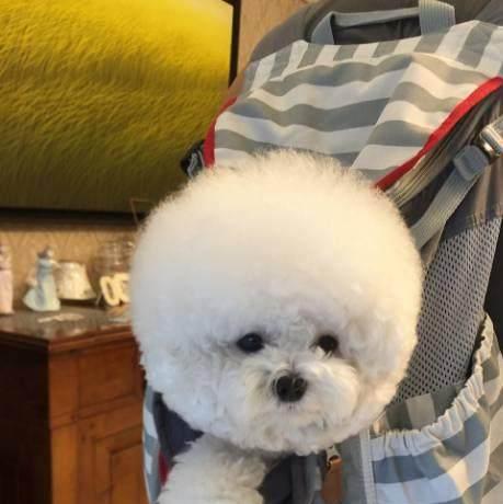狗狗被主人背着,脑袋就像是个棉花糖,毛茸茸的脑袋上点着三个黑点,看着很是可爱!网友直呼:颜值一般的狗狗还真是学不来这造型!