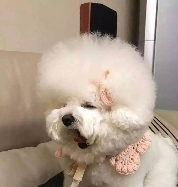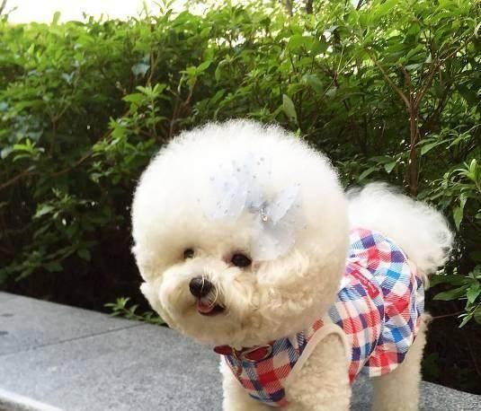 头上戴着蝴蝶结的比熊,看着好萌,穿着小裙子,感觉就像是个小公主一样!