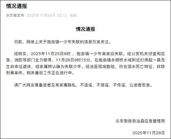经核实,2025年11月25日6时 ,抱由镇一少年离家后失联。经公安机关侦查和应急、消防等部门全力搜寻,11月28日9时15分,在抱由镇永明桥水域附近打捞起一具无生命体征遗体,经家属辨认确为失联少年。经法医现场勘验,符合溺水死亡特征,排除刑事案件。相关善后工作正在进行中。