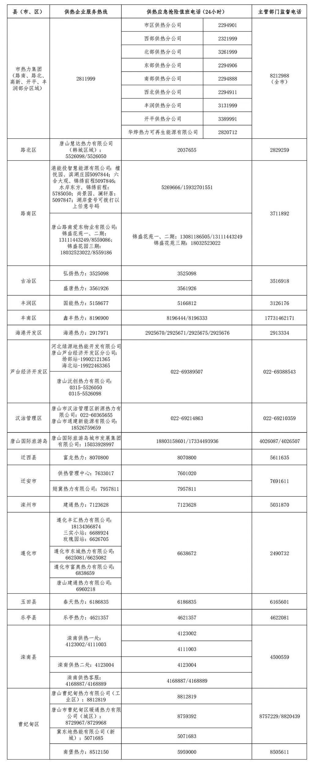 唐山市供热应急服务热线和监督电话