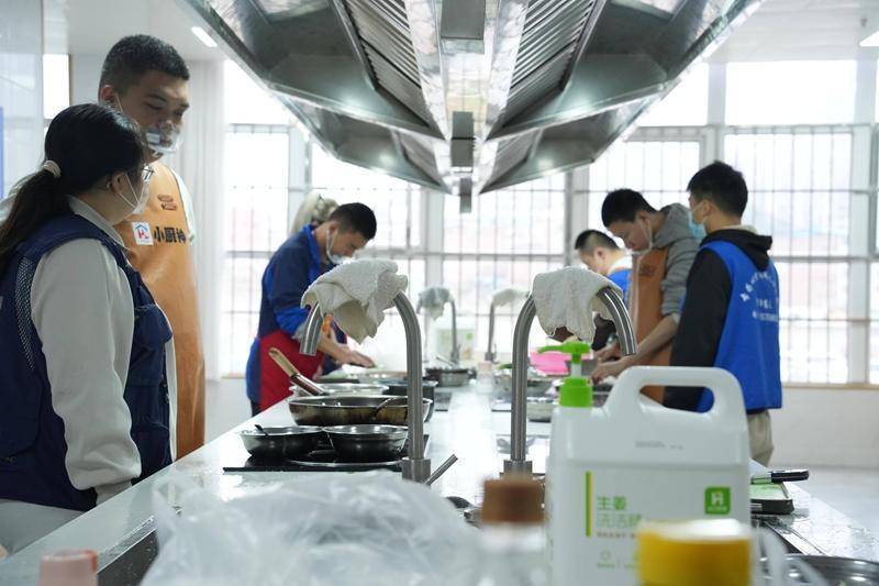 在志愿者帮助下,孩子们在“爱心厨房”尝试参与力所能及的劳动训练。杨菁驰摄
